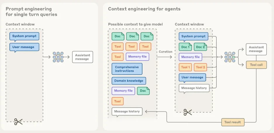 Context engineering, on the other hand, goes beyond prompts. It’s about managing the entire set of information the model sees during inference — including system messages, tool outputs, memory, external data, and message history. As AI agents evolve to handle multi-turn reasoning and longer tasks, context engineering becomes the key discipline for curating and maintaining what truly matters within the model’s limited context window.