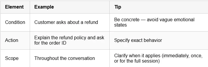 A balanced approach provides clear direction while allowing the agent some adaptability, for example: “Explain our pricing tiers clearly, highlight the value, and ask about the customer’s needs to recommend the best fit.” This ensures the agent remains both reliable and engaging in its interactions.
