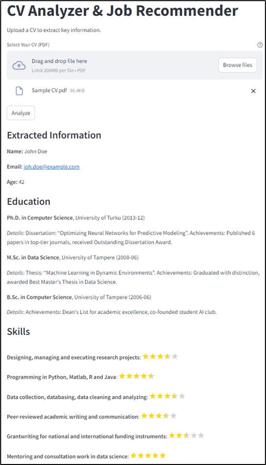In this article, we will develop an application with a simple GUI to analyze an uploaded CV to extract a profile comprising educational credentials, skills, and professional experience, and subsequently recommend top matching jobs matching with the profile, along with an explanation for each selection.