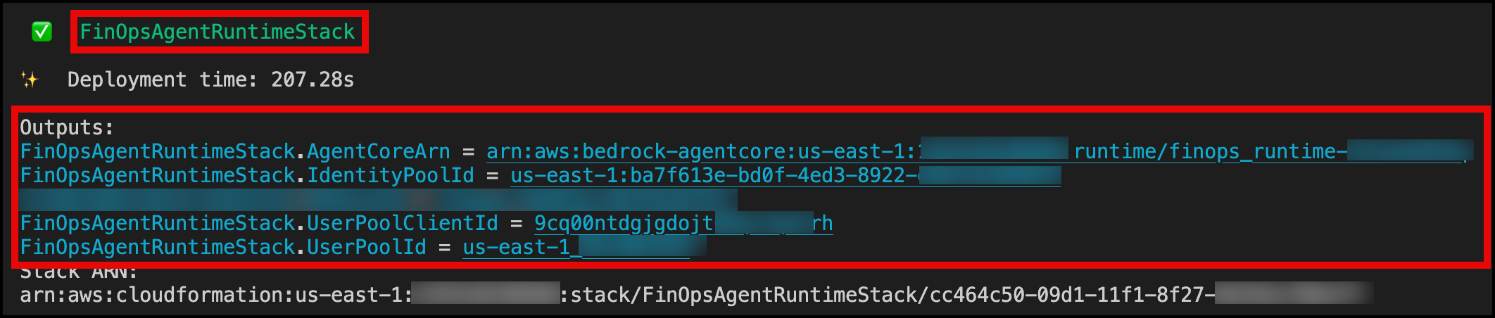 After deployment completes of the last CloudFormation Stack FinOpsAgentRuntimeStack, note the following outputs from the terminal: