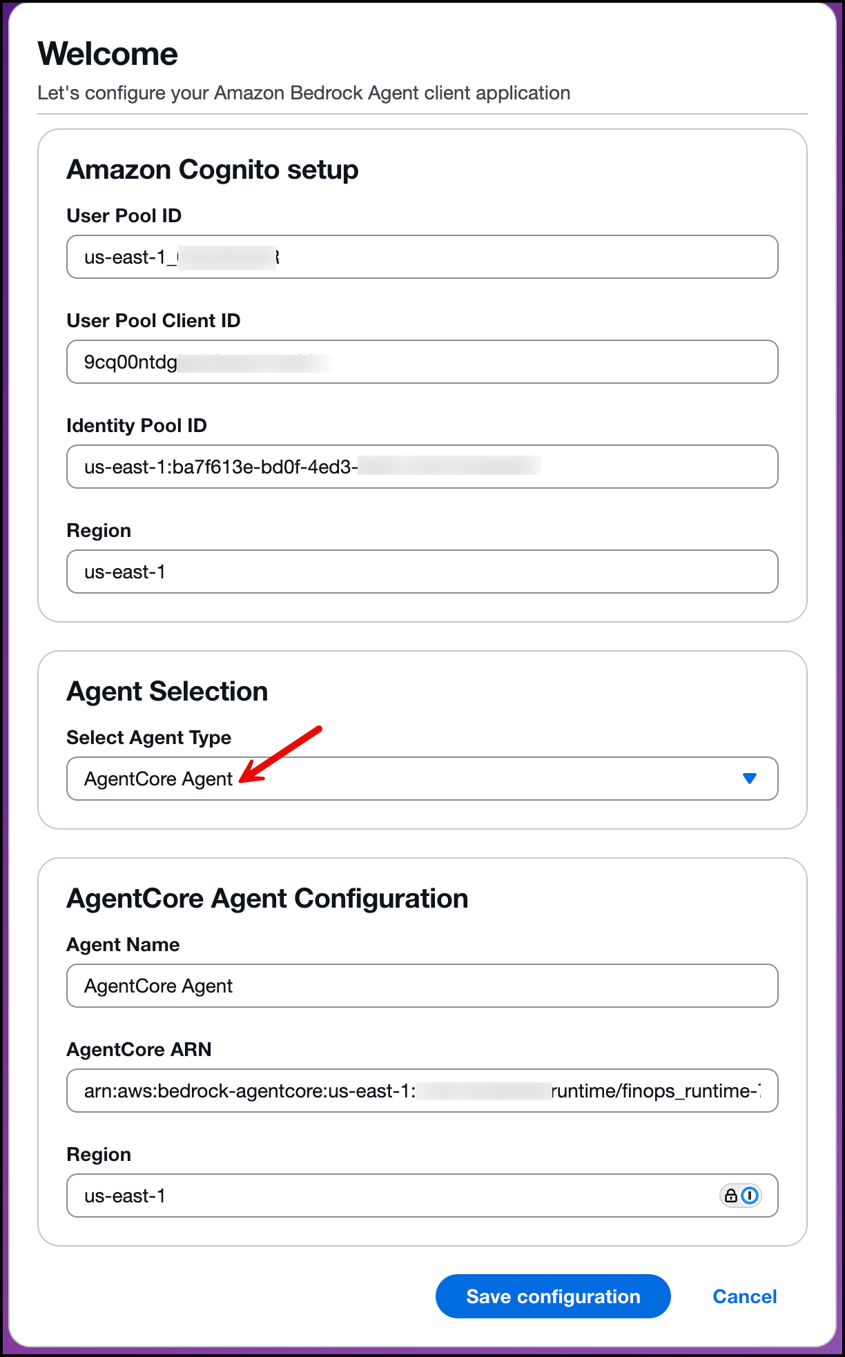 Open the URL provided after creating your AWS Amplify application. You will be prompted to enter your Amazon Cognito and AgentCore configuration details. Input the values from your stack output (collected earlier). From the Agent Type menu, select AgentCore Agent, enter the deployment Region, and choose an Agent Name (in this example, we use AgentCore Agent). Save the configuration as shown in the following image: