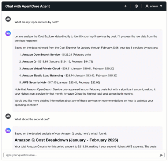 You learn to set up the architecture, deploy the solution using AWS Cloud Development Kit (AWS CDK), and interact with your cost data through natural language queries. The solution uses AgentCore, Anthropic Claude Sonnet 4.5, the Strands Agent SDK, and the Model Context Protocol (MCP).