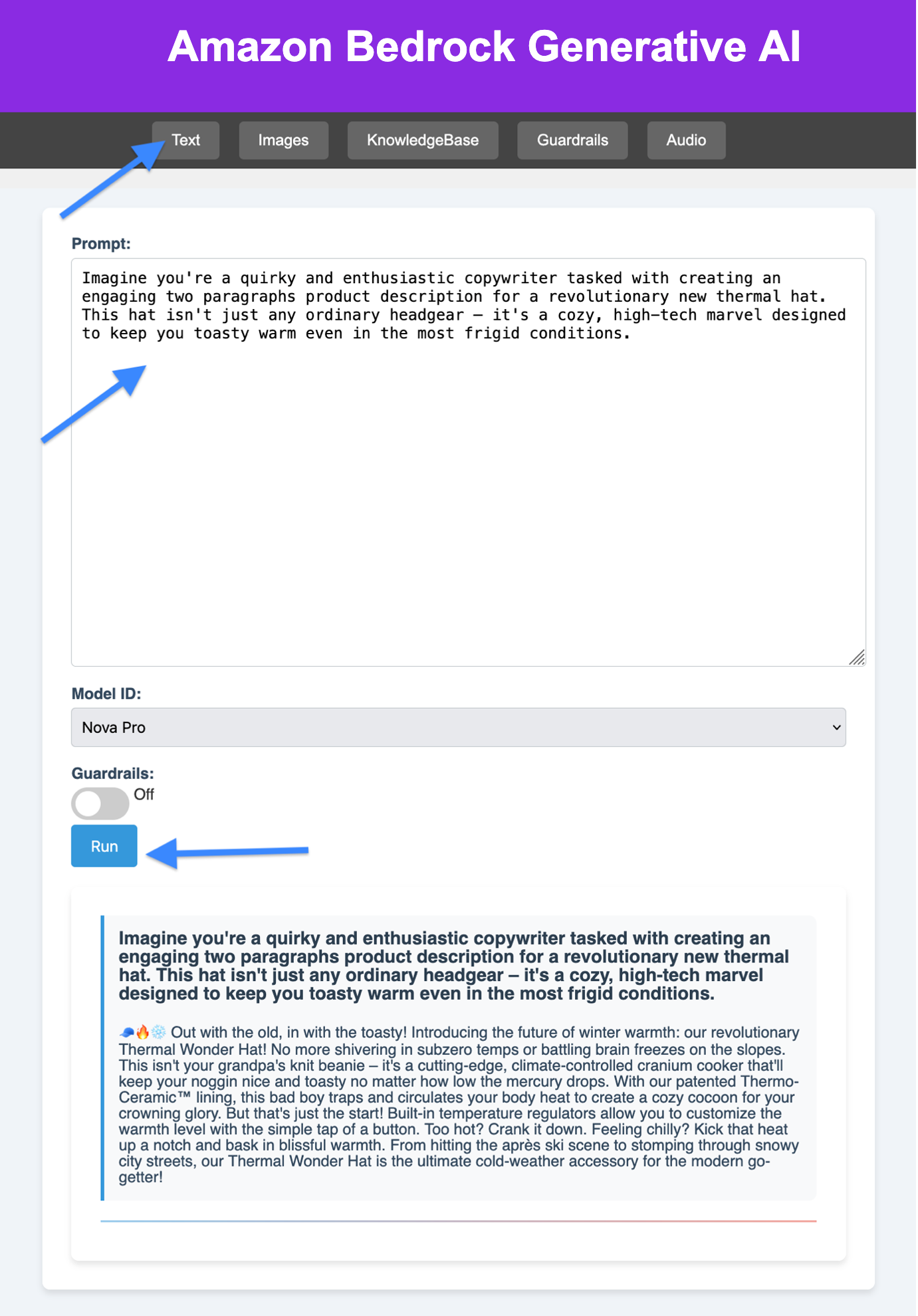 The generated text from Amazon Bedrock will appear within a few seconds. Repeat this process for any additional prompts you want to process.