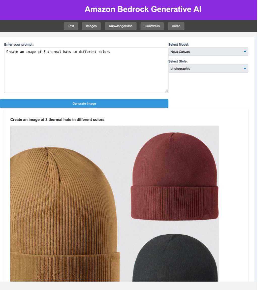 By using Amazon Bedrock and Amazon Nova models, the team can transform its creative process. Amazon Nova models enable the generation of product descriptions and marketing copy. The team creates concept visuals and product mockups with Amazon Nova Canvas, and uses Amazon Nova Reel to produce engaging video content for social media presence. Amazon Bedrock Guardrails can help the team maintain consistent brand guidelines with configurable safeguards and governance for its generative AI applications at scale.