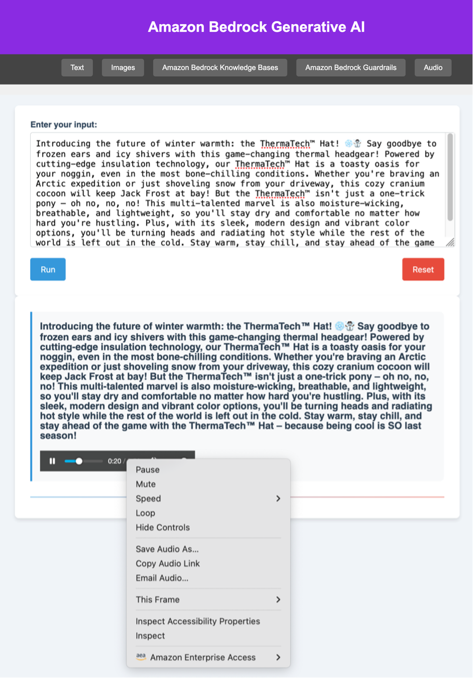The ecommerce company’s creative team wants to develop audio content for marketing campaigns. By specifying the message, brand voice, target demographic, and audio components, they can compose scripts and generate voiceovers for promotional videos and audio ads, resulting in consistent and professional audio materials that effectively convey the brand’s message and values.To use the audio generation feature, follow these steps:
