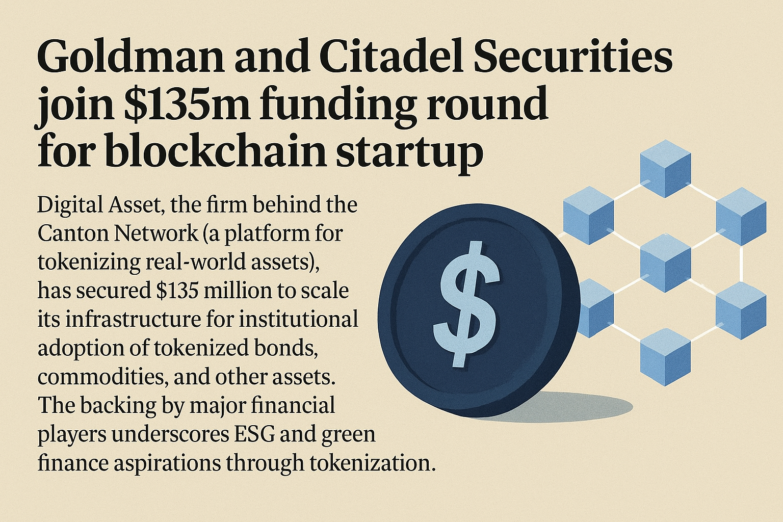 In a landmark move that signals growing institutional confidence in blockchain-based finance, Goldman Sachs and Citadel Securities have joined a $135 million funding round for Digital Asset, the New York–based firm behind the Canton Network — a privacy-enabled interoperable blockchain designed for financial institutions.