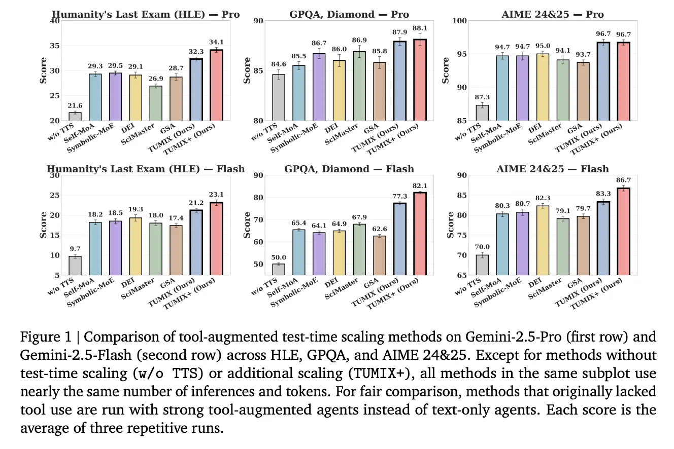 What if, instead of re-sampling one agent, you could push Gemini-2.5 Pro to 34.1% on HLE by mixing 12–15 tool-using agents that share notes and stop early? Google Cloud AI Research, with collaborators from MIT, Harvard, and Google DeepMind, introduced TUMIX (Tool-Use Mixture)—a test-time framework that ensembles heterogeneous agent styles (text-only, code, search, guided variants) and lets them share intermediate answers over a few refinement rounds, then stop early via an LLM-based judge. The result: higher accuracy at lower cost on hard reasoning benchmarks such as HLE, GPQA-Diamond, and AIME (2024/2025).