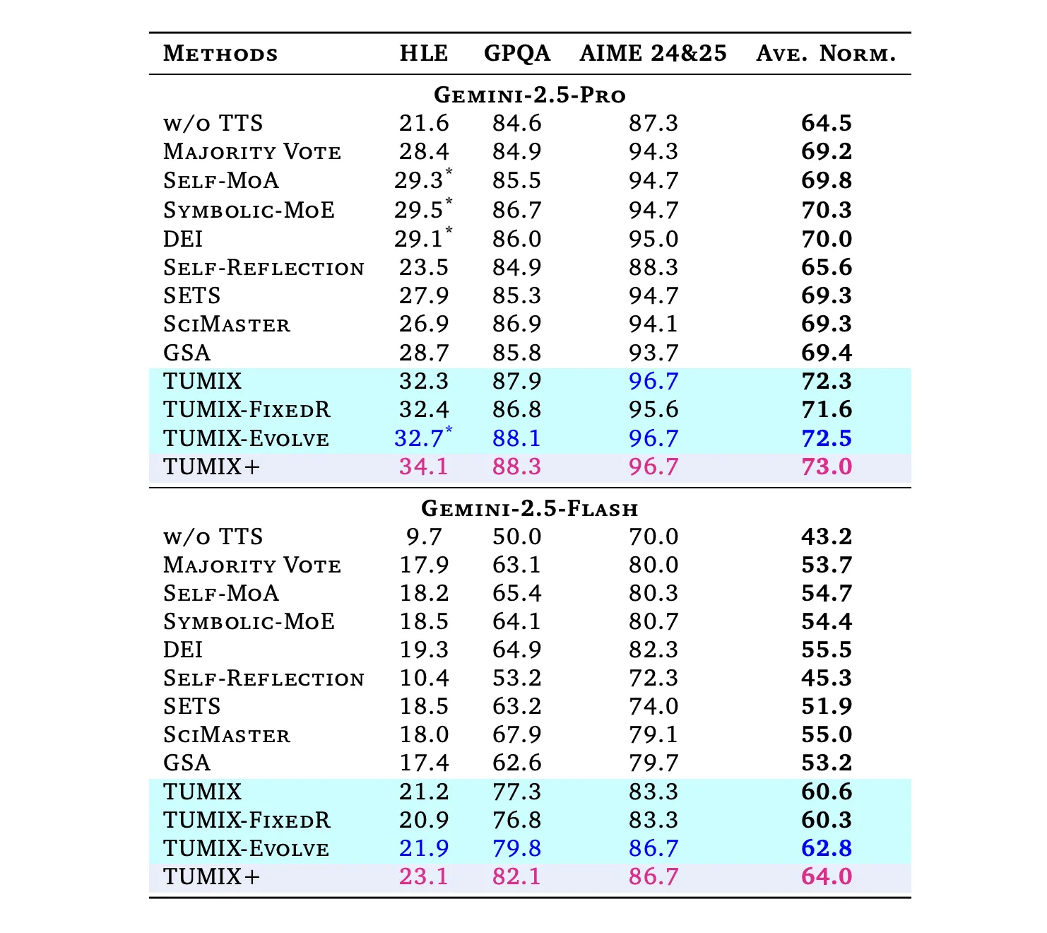- HLE (Humanity’s Last Exam): Pro: 21.6% → 34.1% (TUMIX+); Flash: 9.7% → 23.1%.