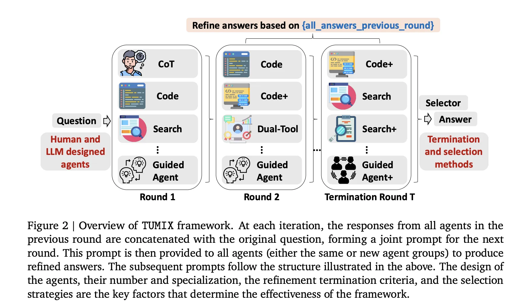 - Mixture over modality, not just more samples: TUMIX runs ~15 agent styles spanning Chain-of-Thought (CoT), code execution, web search, dual-tool agents, and guided variants. Each round, every agent sees (a) the original question and (b) other agents’ previous answers, then proposes a refined answer. This message-passing raises average accuracy early while diversity gradually collapses—so stopping matters.