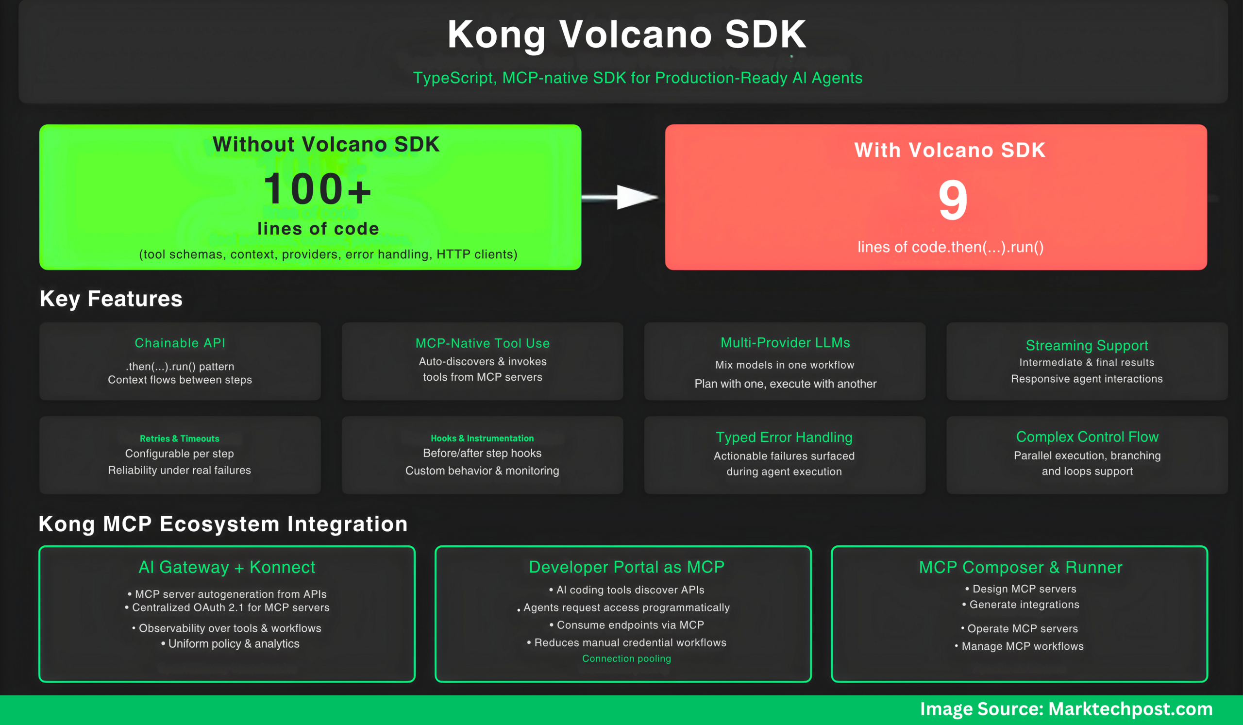 Kong has open-sourced Volcano, a TypeScript SDK that composes multi-step agent workflows across multiple LLM providers with native Model Context Protocol (MCP) tool use. The release coincides with broader MCP capabilities in Kong AI Gateway and Konnect, positioning Volcano as the developer SDK in an MCP-governed control plane.