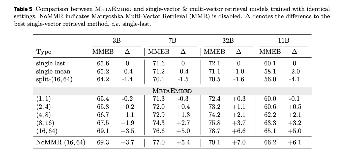 MetaEmbed contributes a serving-time control surface for multimodal retrieval: nested, coarse-to-fine Meta Tokens trained with MMR yield compact multi-vector embeddings whose granularity is adjustable after training. The results show consistent accuracy gains over single-vector and naive multi-vector baselines on MMEB and ViDoRe v2, while clarifying the practical cost profile—encoder-bound latency, budget-dependent index size, and millisecond-scale scoring on commodity accelerators. For teams building retrieval stacks that must unify fast recall and precise re-ranking across image–text and visual-document scenarios, the recipe is directly actionable without architectural rewrites.