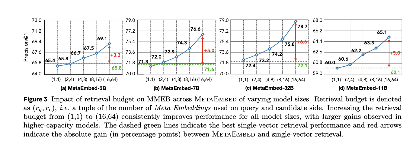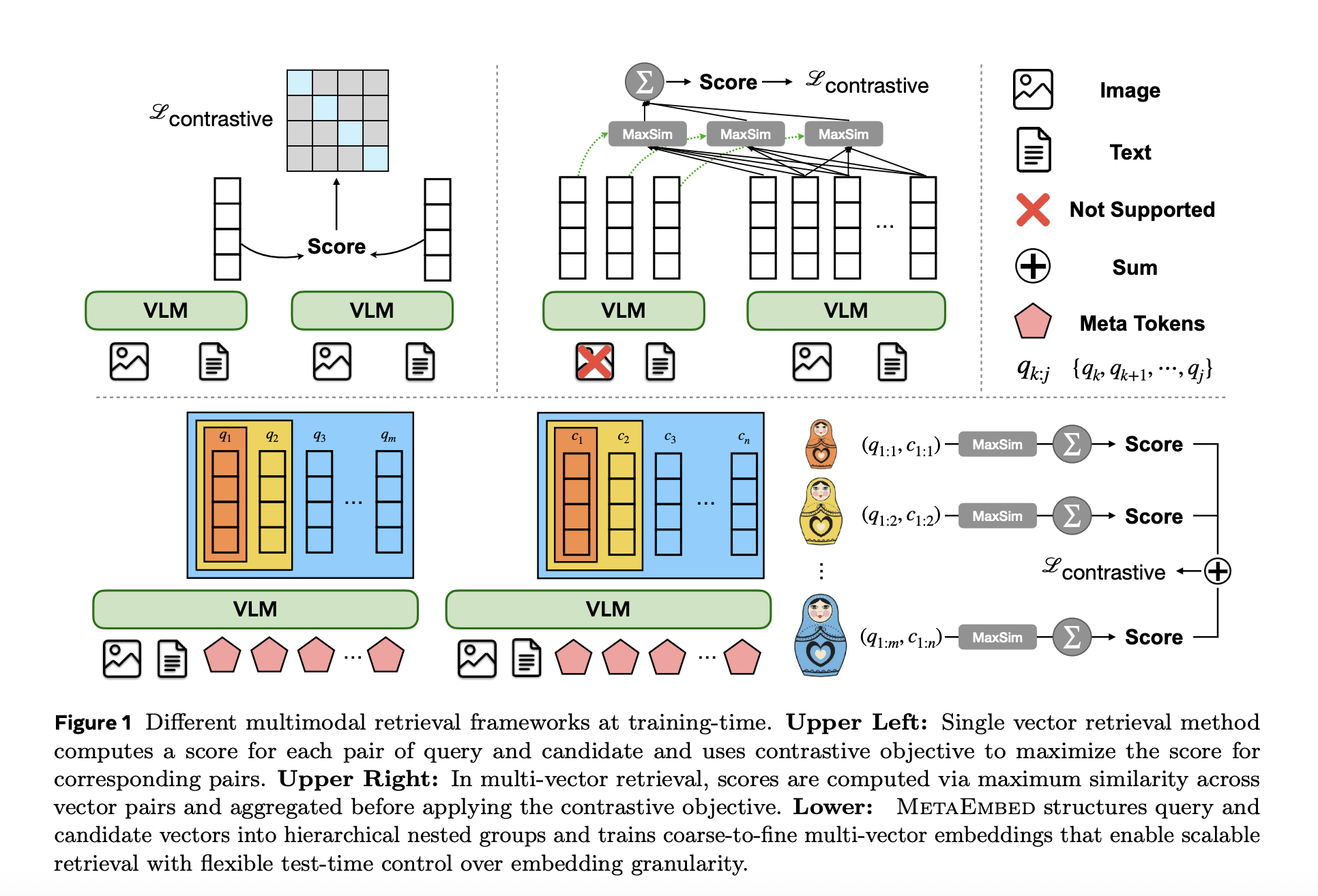 What if you could tune multimodal retrieval at serve time—trading accuracy, latency, and index size—simply by choosing how many learnable Meta Tokens (e.g., 1→16 for queries, 1→64 for candidates) to use? Meta Superintelligence Labs introduces MetaEmbed, a late-interaction recipe for multimodal retrieval that exposes a single control surface at serving time: how many compact “Meta Tokens” to use on the query and candidate sides. Rather than collapsing each item into one vector (CLIP-style) or exploding into hundreds of patch/token vectors (ColBERT-style), MetaEmbed appends a fixed, learnable set of Meta Tokens in training and reuses their final hidden states as multi-vector embeddings at inference. The approach enables test-time scaling—operators can trade accuracy for latency and index size by selecting a retrieval budget without retraining.