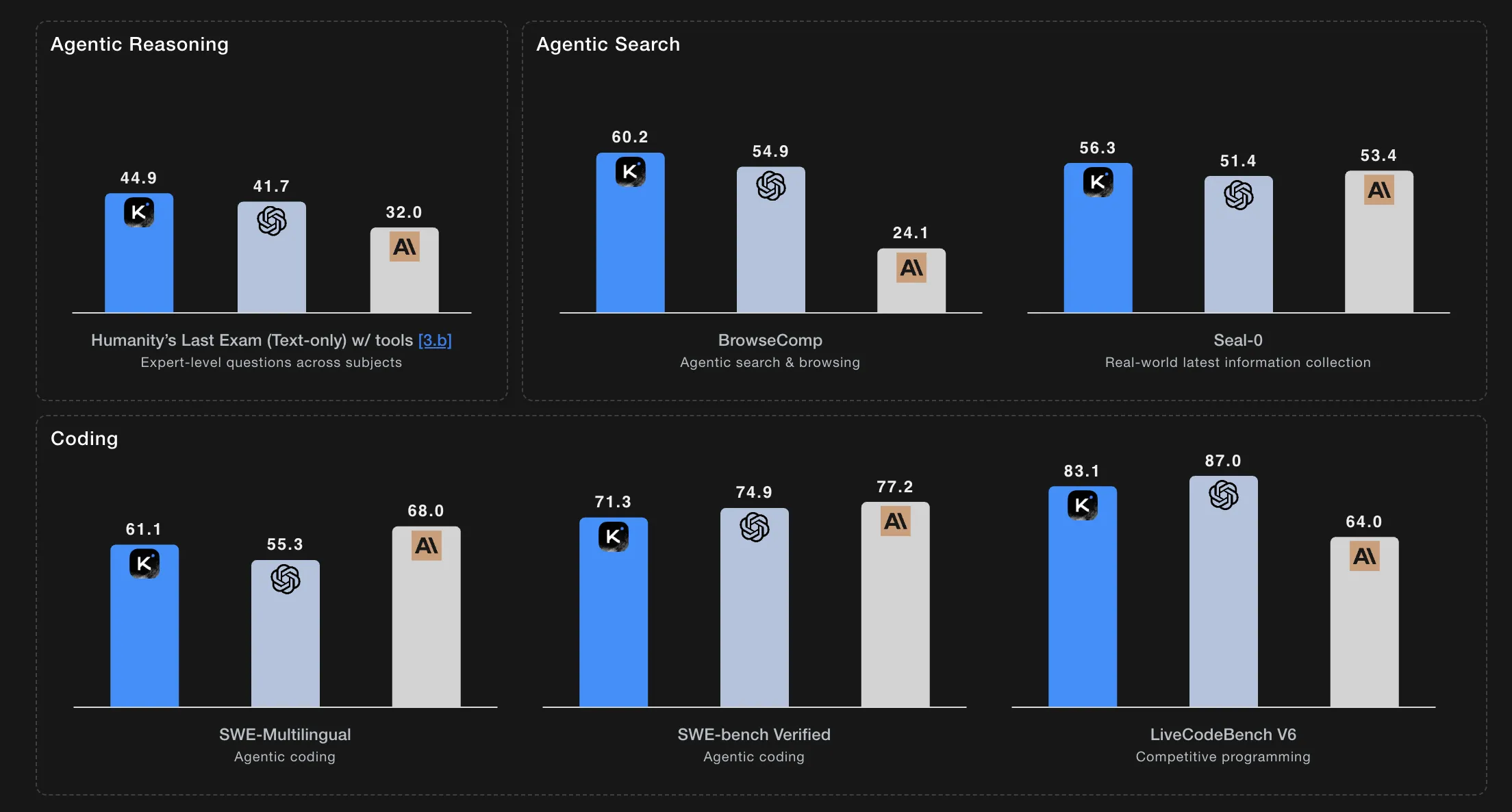 - On public benchmarks, it leads or is competitive on reasoning, agentic search, and coding tasks such as HLE with tools, BrowseComp, and SWE bench Verified with tools, showing that the thinking oriented variant delivers clear gains over the base non thinking K2 model.
