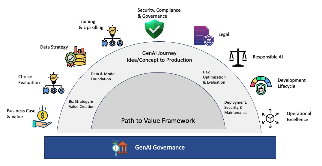 The core challenge with generative AI adoption is not innovation velocity. Initial pilots frequently show strong promise and generate enthusiasm across teams. However, when organizations attempt to operationalize these solutions, progress slows. Data access becomes constrained by security and privacy requirements. Integration with existing enterprise systems introduces unexpected complexity. Governance, compliance, and approval processes add friction. At the same time, teams struggle to define consistent success metrics that connect generative AI capabilities to business outcomes. Without a structured approach, these challenges compound. Many initiatives stall between prototype, production readiness, and value realization. What organizations need is a framework that addresses these issues deliberately and holistically. The right framework reduces friction while accelerating time to value.