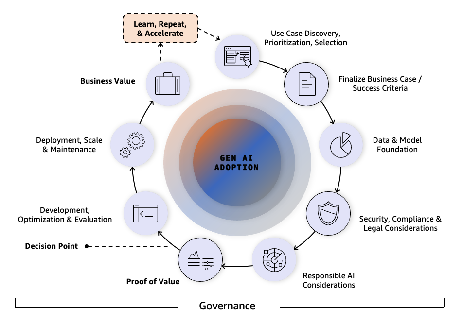 The P2V framework is not intended to be applied as a linear, step-by-step process. Generative AI adoption rarely progresses in a straight line. Instead, organizations should apply the framework flexibly and asynchronously, with multiple pillars addressed in parallel. For example, teams can simultaneously build technical capabilities while establishing governance guardrails and developing business cases for different use cases. This parallel approach can significantly accelerate the overall path to production and value. At the center of the framework is the end-to-end generative AI journey, guiding organizations from initial concept through production deployment and ultimately to measurable value realization. The P2V journey relies on interconnected pillars that require continuous attention across all stages of generative AI adoption. Organizations often engage multiple pillars in parallel, depending on their maturity and constraints. This flexible, holistic approach helps make sure that the critical aspects of generative AI implementation are addressed. Organizations can adapt the framework to their context. However, they should prioritize foundational pillars (business case, data strategy, security, and legal compliance) before advancing to PoC or MVP stages.
