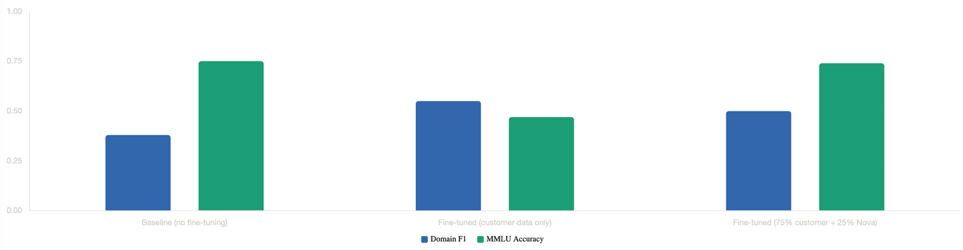 The focus of this post is data mixing: the technique that lets you fine-tune on domain-specific data without sacrificing a model’s general capabilities. In the previous post, we made the case for why this matters, blending customer data with Amazon-curated datasets preserved near-baseline Massive Multitask Language Understanding (MMLU) scores while delivering a 12-point F1 improvement on a Voice of Customer classification task spanning 1,420 leaf categories. By contrast, fine-tuning an open-source model on customer data alone caused a near-total loss of general capabilities. Now we show you how to do it yourself.