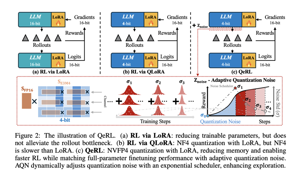 A core empirical finding: deterministic FP4 quantization raises policy entropy, flattening token distributions early in training and improving exploration versus 16-bit LoRA and NF4-based QLoRA baselines. To control that effect over time, QeRL introduces Adaptive Quantization Noise (AQN)—channel-wise Gaussian perturbations mapped into LayerNorm scale parameters and annealed with an exponential schedule. This keeps kernel fusion intact (no extra weight tensors) while transitioning from exploration to exploitation.