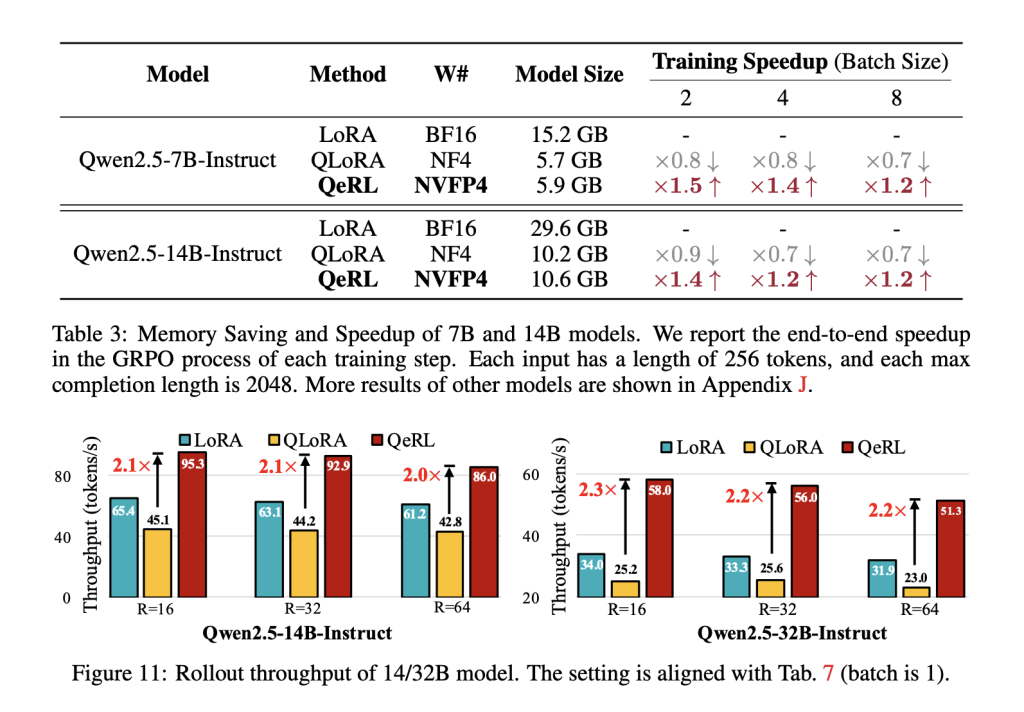 On Qwen2.5 backbone model, the research team show that NVFP4+LoRA outperforms vanilla LoRA and QLoRA in rollout throughput and overall training time, with >2× rollout throughput on 14B/32B models against QLoRA and ~1.8× end-to-end vs QLoRA in a representative setup. They also demonstrate training a 32B policy with GRPO on a single H100-80GB, enabled by the lower memory footprint of weight-only FP4.
