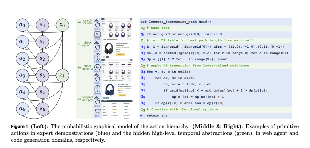 - E-step (latent discovery): use RL to infer temporally consistent latent structures (abstractions) aligned to expert sequences.