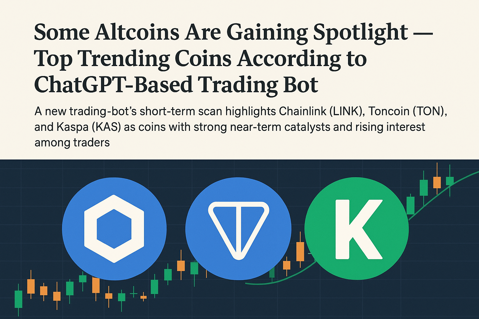 As the crypto market continues to rotate between narratives, traders are increasingly relying on AI‑powered tools to identify short‑term momentum and emerging catalysts. One such ChatGPT‑based trading bot has recently flagged Chainlink (LINK), Toncoin (TON), and Kaspa (KAS) as altcoins drawing rising interest due to near‑term fundamentals, technical strength, and growing market attention.