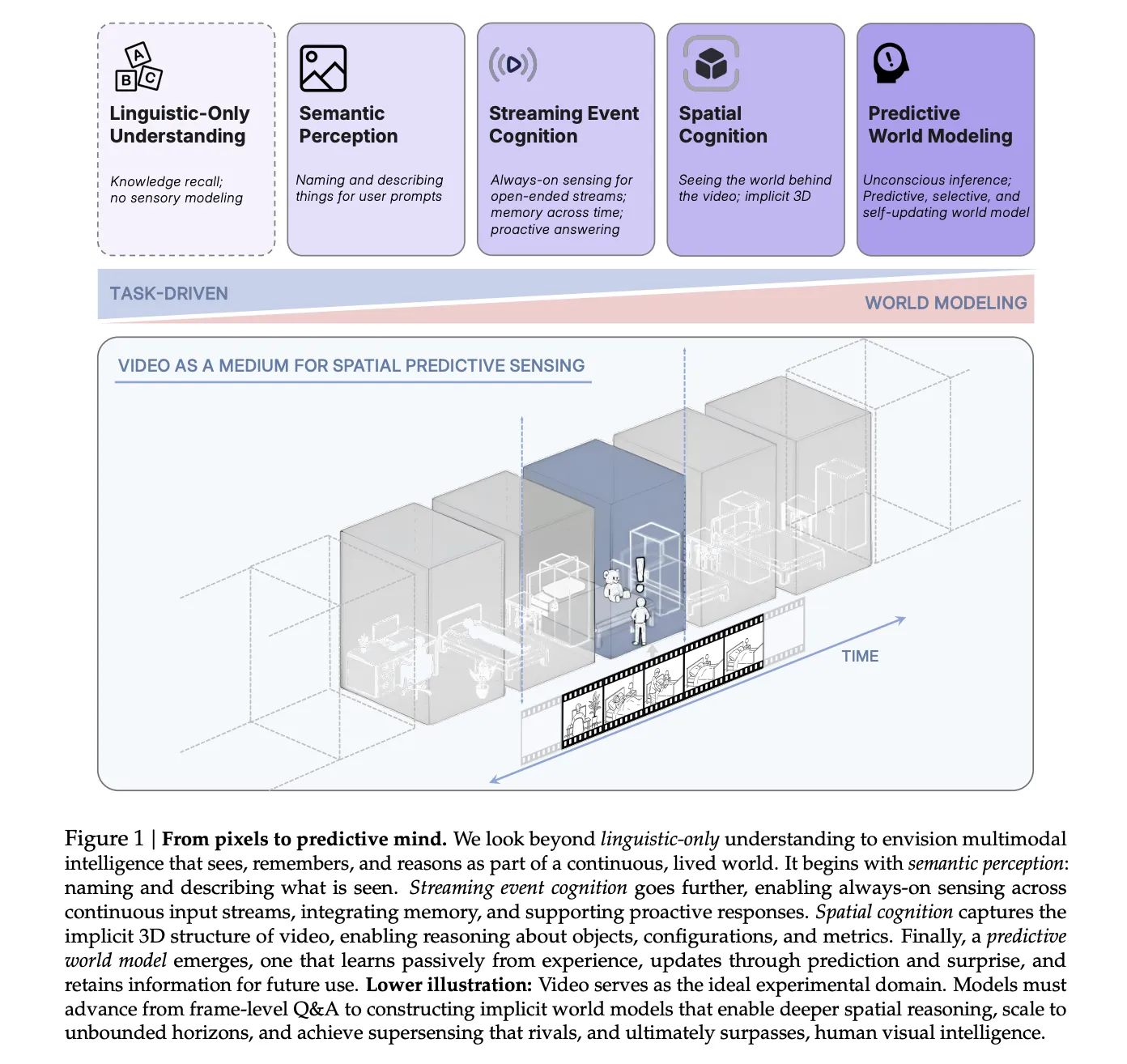 The research team frames spatial supersensing as a progression of capabilities beyond linguistic only reasoning. The stages are semantic perception, streaming event cognition, implicit 3D spatial cognition and predictive world modeling.