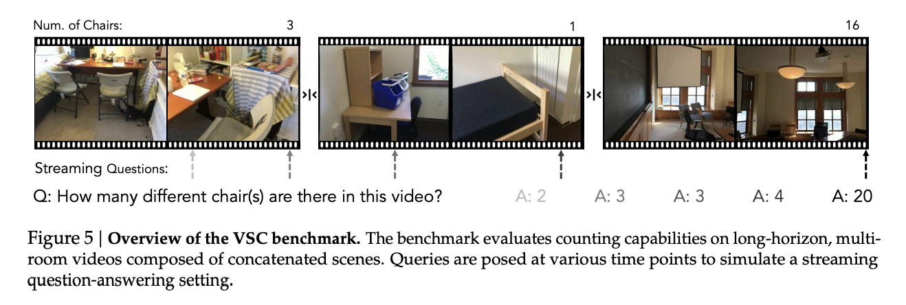 - VSI Super, through VSR and VSC, is intentionally built from arbitrarily long indoor videos to stress continual spatial observation, recall and counting, which makes it resistant to brute force context window expansion and standard sparse frame sampling.
