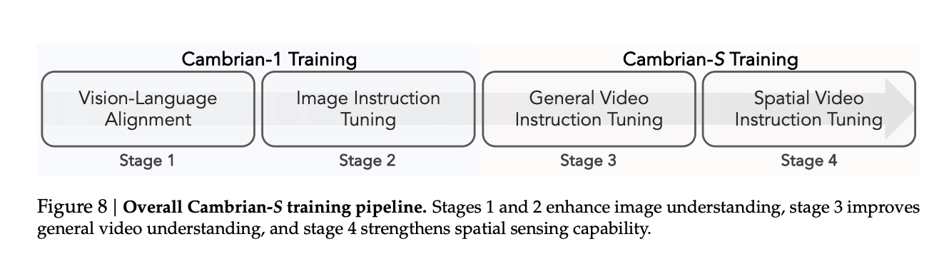 Training follows a four stage pipeline. Stage 1 performs vision language alignment on image text pairs. Stage 2 applies image instruction tuning, equivalent to the improved Cambrian-1 setup. Stage 3 extends to video with general video instruction tuning on a 3 million sample mixture called Cambrian-S 3M. Stage 4 performs spatial video instruction tuning on a mixture of VSI 590K and a subset of the stage 3 data.